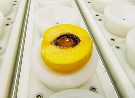 Repasa 320 mitades de melocotón por minuto con cualquier grado de madurez y cualquier variedad (Clingstone, piedra tallada y nectarinas) y permite la eliminación del trabajo para esta operación.